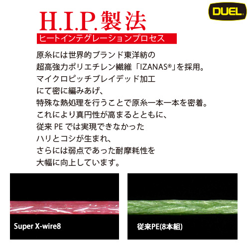 新技術「H.I.P.製法(ヒートインテグレーションプロセス)」で原糸同士の密着度を高める事に成功! 今までのPEラインでは実現できなかった、ハリやコシそして耐摩耗性の向上や色落ちの軽減を可能にしました。※掲載している商品の画像は代表画像を表示しています。また実物と色が違って見える場合があります。あらかじめご了承下さい。