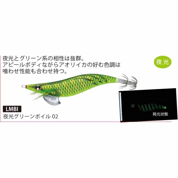 サイズ:3.5号 ウェイト:19g 沈下速度:3.2秒/m 夜光とグリーン系の相性は抜群。アピールボディながらアオリイカの好む色調は喰わ性能も合わせ持つ。 トリックフック ラウンド:根掛かり回収率の高いストレートのトリックフックに掛けたイカをバラしにくいラウンド形状をミックス。 スナッグレスシンカー:引き抵抗を軽減したシンカー。