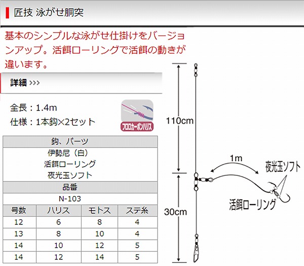 ささめ針 N-103 匠技泳ガセ胴突 鈎14号 -ハリス10号