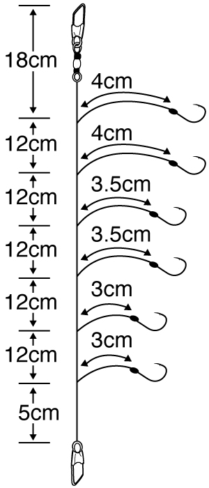 全長:0.76m 仕様:6本鈎×1セット 号数:2 ハリス:0.3 モトス:0.4 鈎、パーツ:新秋田狐(ケイムラ)