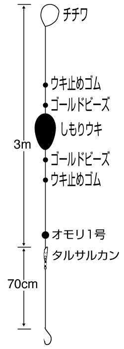 全長:3.7m 仕様:1本鈎+スペア鈎2本 号数:S 海小物:4 ハリス:0.8 道糸:2 鈎、パーツ:海タナゴ(白)