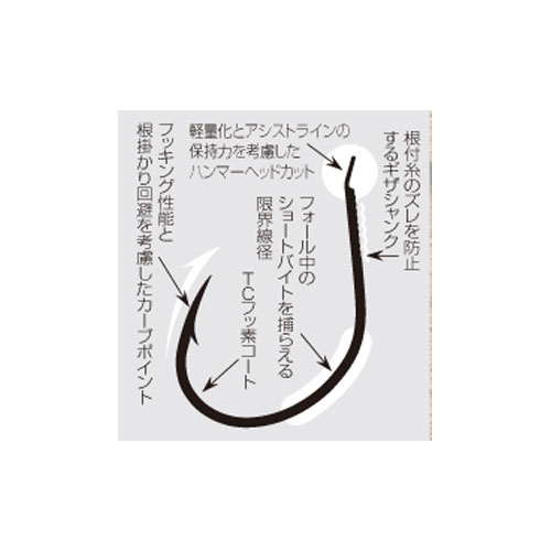 ライトジギングにおける最高の軽さと刺さりの良さを追求したフック「スパーク」にフッ素コート加工をプラス。フック表面の摩擦抵抗を極限まで無くし貫通性能を向上。ターゲットがフックポイントに触れただけで一気にフトコロまで刺さりきる。超極細フックにつき強引なファイトは禁物。ドラグテンションとタックルバランスを考慮してフックのポテンシャルを最大限に引き出して頂きたい。※掲載している商品の画像は代表画像を表示しています。また実物と色が違って見える場合があります。あらかじめご了承下さい。