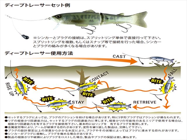 プラグを未開の楽園へと誘う異形の錘。水深が浅ければ浅い程、プラグの選択肢は多い。しかし、深くなるにつれ、その選択肢は狭まってしまう。小型のクランクベイトや大型のビッグベイトなどでディープレンジを攻略する事は難しかった。板オモリやヘビーキャロライナリグを用いて潜航させるという手もあったが、前者は重量を増やすとプラグアクションが崩れるという弱点が、後者はキャスティング性能、スナッグレス性能が低下するという弱点があった。プラグの動き・キャスト性能の低下を最小限に留め、スナッグレス性能を維持したまま、ワームや大型クランクベイトなどでしか到達出来なかったエリアに前述のプラグを送り込む。それが、このディープトレーサー。これまでこのようなプラグの侵入を拒んできたエリアへの侵攻は、異次元の釣果を叩きだす。※掲載している商品の画像は代表画像を表示しています。また実物と色が違って見える場合があります。あらかじめご了承下さい。