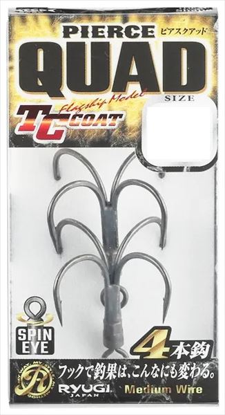 ピアストレブルの形状を受け継いだワイドゲイプ設計の4本鈎、ピアスクアッド。異次元の貫通力を生むTCコート。軸線径を細軸化することによりバイトを掛けることに特化した。掛けてからは360°回転追従するスピンアイでバレを抑制。「運」に泣かないための掛け重視という選択肢。