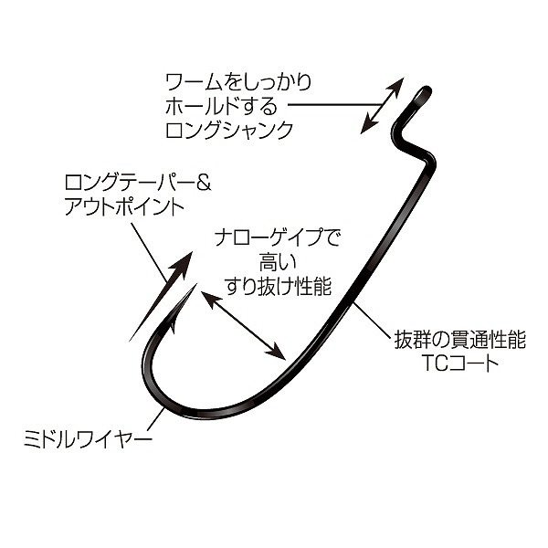 ライト〜ミドルタックル専用設計。刺さりとすり抜け性能を特化させたフィネスオフセットフック。ロングテーパー&アウトポイント設計にさらにTCコートを施した貫通性能重視のフックです。