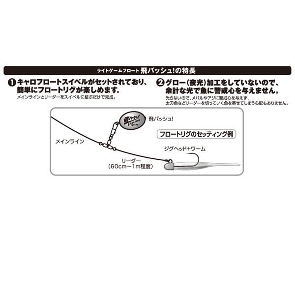 「シャローエリアを広範囲に探りたい」「さらに遠くのポイントを攻略するための飛距離がほしい」「バイトだけでなくルアーの動きを確実に感じ、ストレスなく自然に演出したい」「レンジを完全掌握した攻略がしたい」…そんなアングラーの要求を満たしてくれるのが【フロートリグ】。そのための最適で便利なフロートが【飛バッシュ!】です。