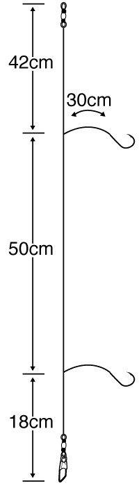 全長:1.1m 仕様:2本鈎×2セット 号数:13 ハリス:3 モトス:4 鈎、パーツ:丸セイゴネムリ(金)