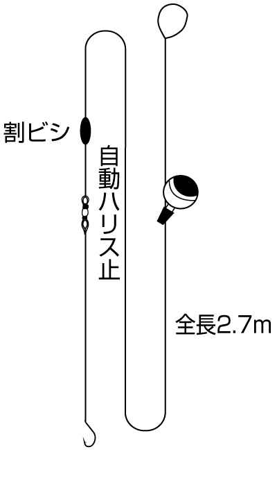 全長2.7mのハゼ玉ウキ仕掛。タナ合わせが肝心。