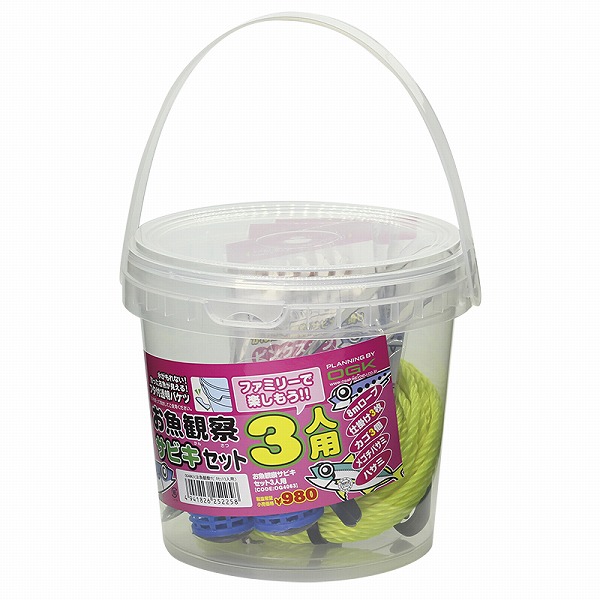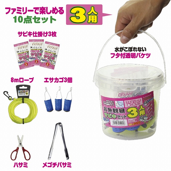 8mロープ、エサカコ3個゛、サビキ仕掛け3枚、フタ付透明バケツ、ハサミ、メゴチバサミの10点セット