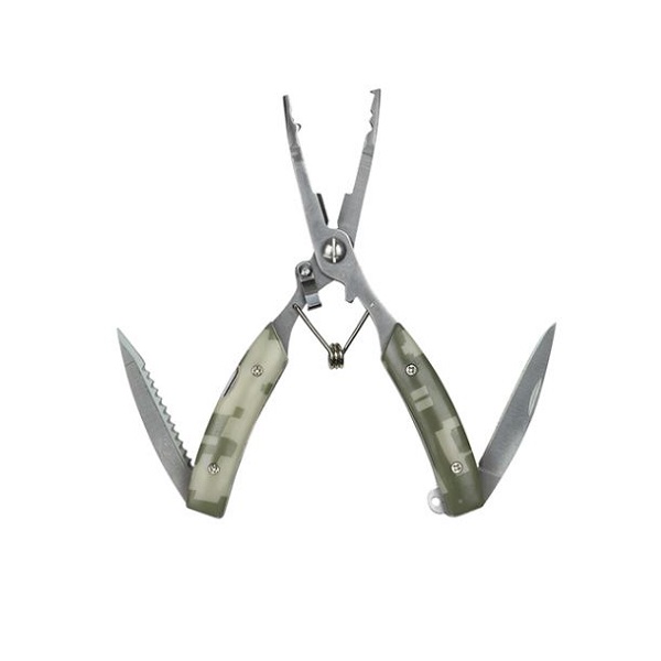 多機能なストレートタイプのプライヤー。スプリットリング外し、針はずし、PEラインカッター、ガン玉潰し、折り畳み式ナイフ、折り畳み式うろこ落としがこの1本に集約。全長16cmと使い勝手の良いスタンダードサイズ。1本で6役こなす便利なプライヤー。