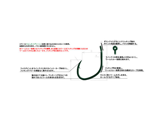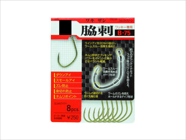 脇刺とは侍が常に身に付けている脇差し刀のように、バスタックルの中に常に備えて頂きたいHOOKです。オーソドックスなフォルムの中にも、ワッキースタイルにおけるワームのホールド性はもちろん、ずば抜けたフッキング性とミスバイトを防ぐために最も重要な、ワームスルー効果を最大限に発揮する理想のカーブを追求しました。バスを掛ける事だけを考え抜いて完成したワッキーフックの最終型の登場です。※掲載している商品の画像は代表画像を表示しています。また実物と色が違って見える場合があります。あらかじめご了承下さい。