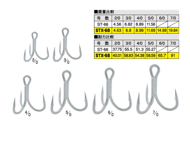 [強度]全サイズ6%以上パワーアップ。従来線材(ST-66等)と比較すると、タフワイヤー素材「STX-68」の耐力は全サイズにおいて6パーセント以上の向上を達成。66同様、過剰に太い線材径にすることをせず必要充分な強度を有します。 [鋭さ]太いのに、激鋭です!強度、耐久性の向上はハリ先のロングテーパー化を可能にしました。鋭く、しかも速やかな初期掛かりを実現はより速やかな貫通を実感いただけるものとなりました。 [重量・線径]全サイズST-66と同線径、同重量です。ST-66と同重量です。従来のST-66をご