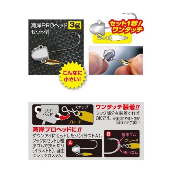 マイクロサイズでも超アピール■ワンタッチ装着!!フック部分を装着すればOKです。※強引にやると曲がりますので丁寧に!■湾岸プロヘッドに!!ダウンアイにセットしたり(イラストA)、フックにセットし極小ゴムで挟んだり(イラストB)、自由にレッツカスタム!