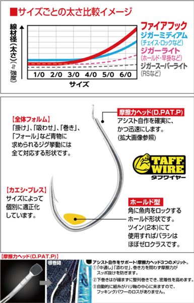 【ファイアフックってどんなハリ?】小型青物から大型のヒラマサ・カンパチまで。ジグ30gから300gまでこれひとつで完結する青物専用ジギングフックです。【ファイアフックの特徴】3/0まではジガーライトクラスの細軸、4/0でジガーミディアムクラスの中軸、6/0では一気に太くなる可変設定です。【ファイアフックのこだわり】「ワンピッチジャークに相性が良いこと」「どんな操作にも対応すること」です。またハリ先、やプレス、カエシなどは各サイズごとに個別設定されています。しかも「摩擦力ヘッド」でアシスト自作はとても簡単になりました。