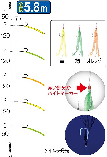 扱いやすさ圧倒的!めっちゃ短いシリーズに真鯛チョクリが登場! 通常のチョクリ仕掛けだと全長10m以上は当たり前ですが、この仕掛けはめっちゃ短く5.8m!ショートロッドでの使用やビギナーやマイボート、リレー釣りなどのチョイ釣りに便利です。 漁師直伝。厳選素材”スズランテープ”を使用。(テープの良し悪しはチョクリ仕掛けの命そのもの。カットにもこだわり細かな動きが出るように仕上げました。) 捕食虫垂を刺激するバイトマーカー&ケイムラフック。(確実にフッキングに持ち込むためチモトにはバイトマーカー&ハリにはケイムラを施しフッキング率をUP!)※掲載している商品の画像は代表画像を表示しています。また実物と色が違って見える場合があります。あらかじめご了承下さい。
