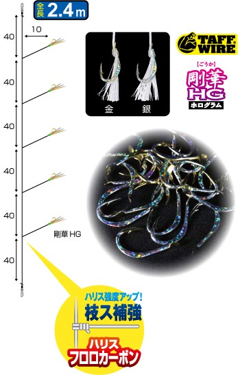“スーパーホログラム”がベイトの捕食中枢を強烈に刺激!!ベイト付きが圧巻!どこでも使いやすい本格スタンダード仕掛● 扱いやすい全長2.4m● 強力転写ではがれにくいスーパーホログラム● 枝ハリス補強でハリスの強度UP● 最強素材「TAFF WIRE」