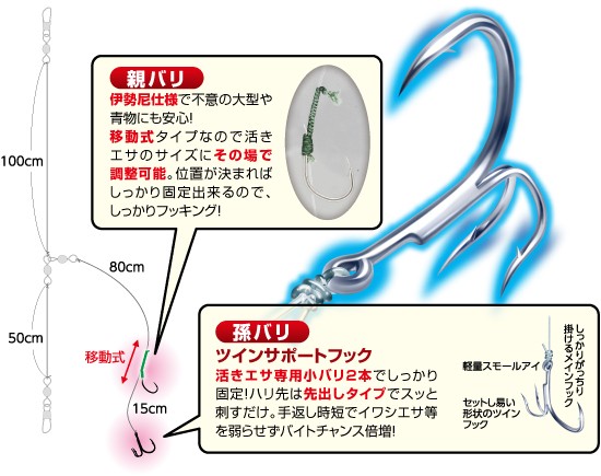 海域を選ばない基本仕様!【親バリ】伊勢尼仕様で不意の大型や青物にも安心!移動式タイプなので活きエサのサイズにその場で調整可能。位置が決まればしっかり固定出来るので、しっかりフッキング!【孫バリ】ツインサポートフック活きエサ専用小バリ2本でしっかり固定!ハリ先は先出しタイプでスッと刺すだけ。手返し時短でイワシエサ等を弱らせずバイトチャンス倍増!