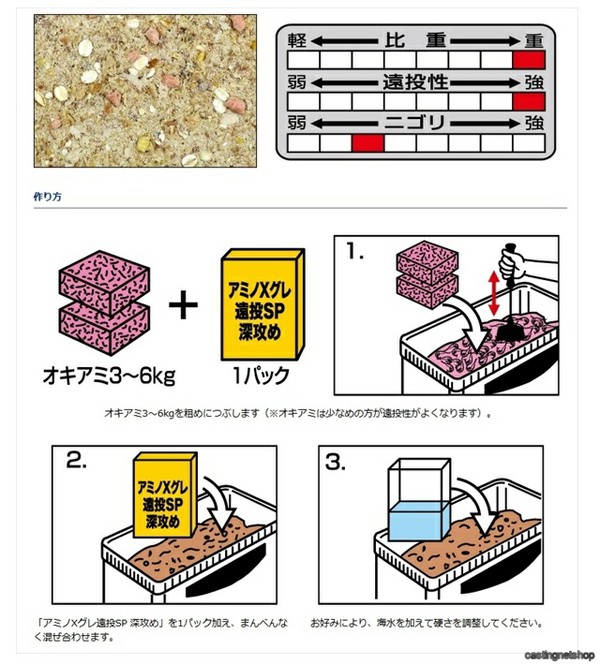 岡田建治テスター監修数ーの大型グレの実績に基づいた大型・深棚狙いに特化した実践的配合エサ 従来はグレは浮かせて釣るのが常識。しかし近年はプレッシャーにより警戒心の強い大型グレはそう簡単には浮いてこないのが現実。その浮かない大型グレを狙い撃つための深棚攻略用のスペシャル配合エサ。■1パック重量約2.250gという超高比重で粘りのある素材を大量配合し、オキアミを深いタナまで届ける。■重さと粘りで遠投性能にも優れるため、遠くて深いポイントも攻略可能。■集魚効果に優れる「アミノX」を含め、浮いてこない大型グレを深い棚から誘い出して食わせるための特殊配合。