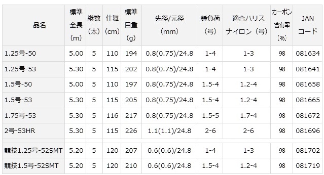 標準全長(m):5.30 継数(本):5 仕舞(cm):115 標準自重(g):205 先径/元径(mm):0.8(0.75)/24.8 錘負荷(号):1.5-4 適合ハリスナイロン(号):1.2-4 カーボン含有率(%):98