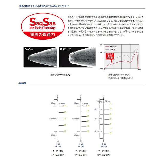 久保田稔監修、ショート&細ハリスで手返し重視の速攻ワカサギ仕掛け。ダイワオリジナル、キープ(袖型)はバラシが少なく多点掛けに有利。ケイムラ金針(KK)「速攻」シリーズは、シーズン初期やマズメ時に効果の高い金針、さらに高集魚効果のあるケイムラコートを採用したワカサギ攻略の新アイテム。このケイムラコート、サクサス程の滑りは無いが通常のメッキより表面がスムースになり、刺さり性能向上してる。(久保田テスター談)