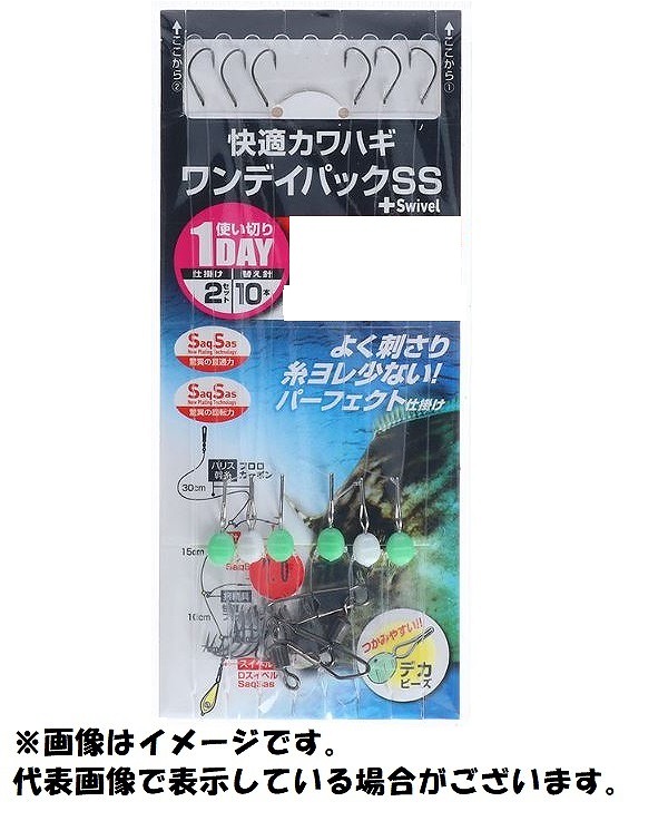 人気のワンデイパックカワハギ仕掛けがサクサススイベル付でリニューアル。■驚異の貫通力を持ったサクサスフック搭載、カワハギの堅い口を貫通します。 ■スイベルは驚異の回転力のサクサススイベルなのでリーダーのよれが激減。 ■快適フックビーズデカを使用しておりますので、船上でもハリス交換が簡単。
