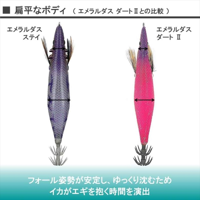 山田ヒロヒトが考える釣る為のエギを具現化。高重量と独特のボディー形状により想像を超えた飛距離を実現した。さらに、スタビライザーと低重心設計により揺ぎない安定感を実現。圧倒的な飛距離、安定したフォールがもたらす相乗効果で今まで捕れなかったイカを狙い打ち。ダート系エギとは一線を画す今までにない新しいエギの提案です。※掲載している商品の画像は代表画像を表示しています。また実物と色が違って見える場合があります。あらかじめご了承下さい。
