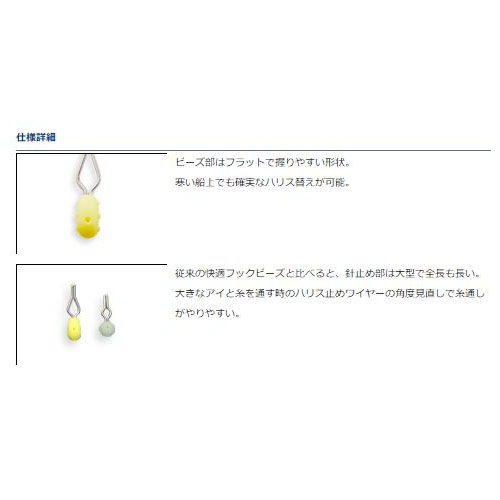 カワハギ仕掛けなどで重宝する従来の快適フックビーズにデカシリーズよりも、ビーズ部、ハリス止め部がデカい『快適フックビーズ デカ』。寒い冬場での利用を考慮し、ビーズ部はフラット型仕様。船の上でもハリス替えが簡単に出来る。ハリス止め部は真鍮製ワイヤーを使用し、先端に微妙な隙間を設ける事により糸つぶれがしにくく、ハリスを固定する事が可能。ハリスを通す時にハリス止め部のワイヤー角度を見直すことにより、糸が入りやすくなっているのが特徴。