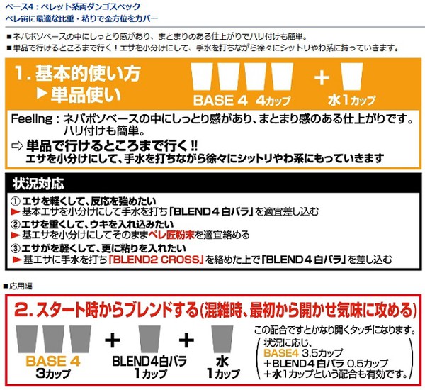正統ペレ宙ネバボソタッチ。3種のペレットを配合し最適な重さ、ネバリを具現化した高活性時に活躍するペレット系両ダンゴ。ベース4:ペレット系両ダンゴスペック ペレ宙に最適な比重・粘りで全方位をカバー■ネバボソベースの中にしっとり感があり、まとまりのある仕上がりでハリ付けも簡単。■単品で行けるところまで行く!エサを小分けにして、手水を打ちながら徐々にシットリやわ系に持っていきます。※掲載している商品の画像は代表画像を表示しています。また実物と色が違って見える場合があります。あらかじめご了承下さい。