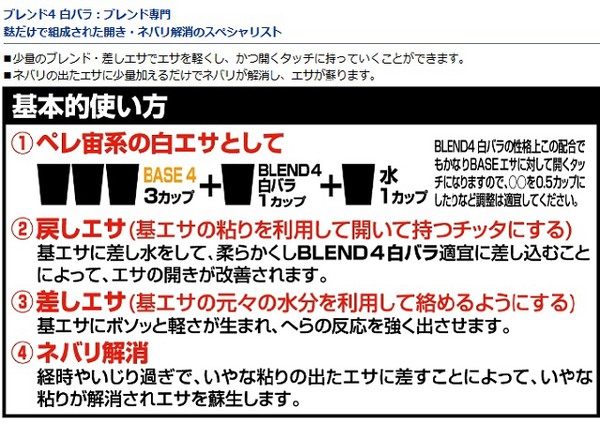 軽くし、ハンナリと開かせる。少量のブレンド・差しエサでエサを軽くし、かつ開くタッチに持っていくことができる。 ブレンド4 白バラ:ブレンド専門 麩だけで組成された開き・ネバリ解消のスペシャリスト ■少量のブレンド・差しエサでエサを軽くし、かつ開くタッチに持っていくことができます。■ネバリの出たエサに少量加えるだけでネバリが解消し、エサが蘇ります。※掲載している商品の画像は代表画像を表示しています。また実物と色が違って見える場合があります。あらかじめご了承下さい。