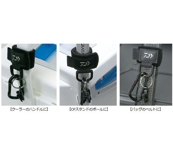 クーラー本体に取り付けて便利にカスタマイズできる付属パーツ、CP(クーラーパートナー)シリーズ■小物類を好きな場所に取り付けられる便利なホルダー機能付きベルト しっかり固定できるクロロプレン製ベルト&面ファスナー仕様。クーラーのハンドル、CPスタンドや竿掛けのポール、バッグのベルトなど様ーなものに取り付け可能。