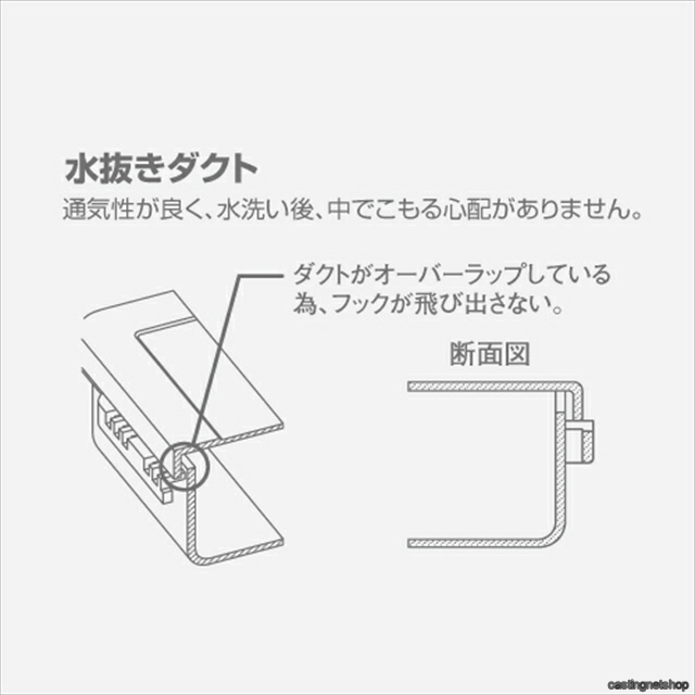 水抜きダクトを搭載しているので、ルアーを入れた状態で丸洗いが可能。仕切りが無いのでガッツリ詰め込める完全マルチタイプ。