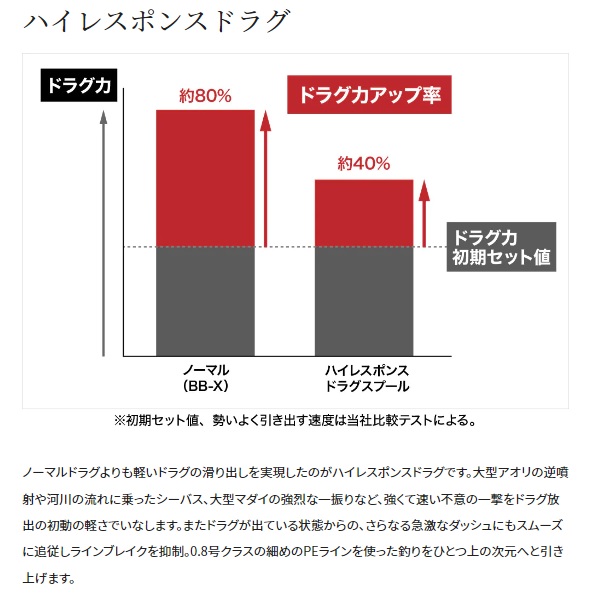 意のままに操る。ルアーのためのレバーブレーキ。ハイパーフォースLBは多彩なルアーフィッシングに対応するため新たに構築したLBリールです。従来の磯釣り用レバーブレーキに比べ、レバーを引く力に比例したスムーズなブレーキ調整が可能なEXS(エクス)ブレーキを搭載。レバー形状もレバー横から糸が取りやすい専用ストレートレバーを搭載。シーバスやエギングはもちろん、ローター逆転のテクニカルなフォールを駆使した一つテンヤやメタルスッテなど、活躍のステージはオフショアへも拡大しました。また急激で強烈な引きに滑らかに追従するハイレスポンスドラグにより、細いPEラインでの大物捕獲力も向上。先進フィーチャーがつくるルアーフィッシングの新しい領域、LBゲームを存分にお楽しみください。