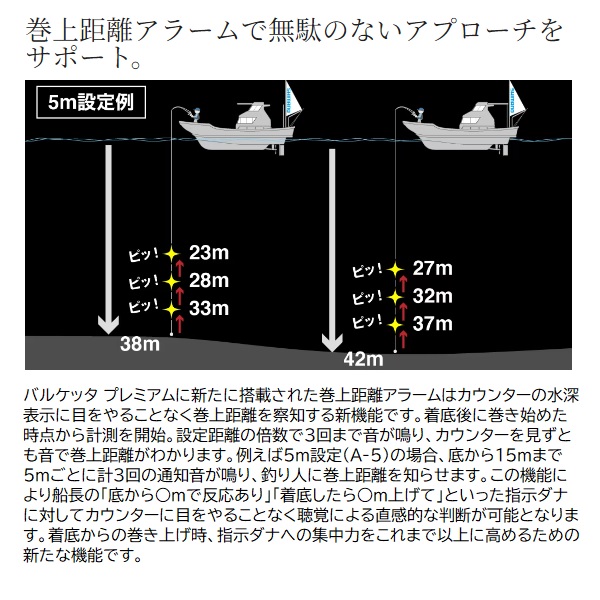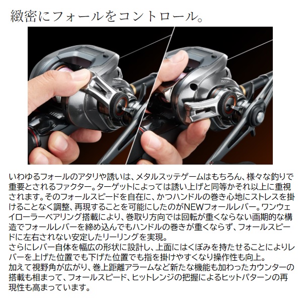 快適に巻き、意のままにフォールを演出。マイクロモジュールギア搭載、HAGANEボディとX-SHIPにより滑らかな巻きごこちと剛性を備えるカウンター付軽量リール、バルケッタプレミアムが更なるアップデートを遂げて登場。ワンウェイローラーベアリング搭載でブレーキをかけてもハンドル回転が重くならないNEWフォールレバーを搭載、スローフォールの誘いが有効となるメタルスッテ、タチウオ、ヒラメ、一つテンヤ、鯛ラバ、SLJなどにおいて、巻きごこちをスポイルすることなく幅広く精密なフォールスピード調整を可能にします。視認性が向上したNEWラインカウンターに加え、設定距離ごとに音が鳴る巻き上げ距離アラームにより巻き始めからの距離を耳でも把握できるためティップから目を離すことなくタナを知ることが可能。ハンドルはシングルハンドル、ダブルハンドル共に60mmのロングハンドル仕様。CI4+素材などにより前モデルと比較して大幅な軽量化も達成しました。