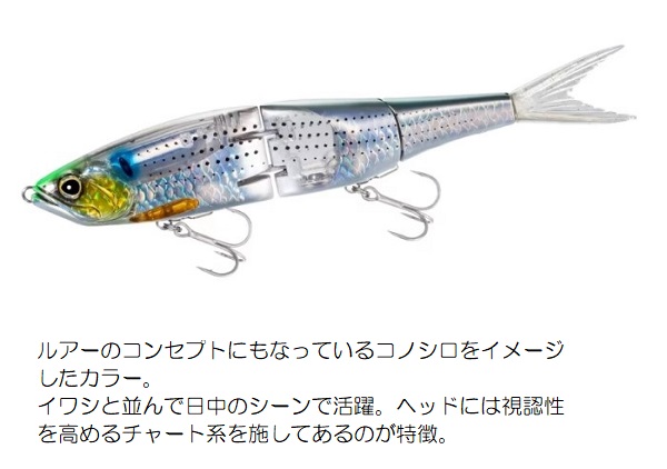 カラー:Aコノシロ タイプ:フローティング 全長:280mm 重量:135g 飛距離:52m 潜行深度(参考値):0.2m スイムフォーム:5° 流速スペック:37cm/秒から フック:2/0x2 ※実物と色が違って見える場合があります。あらかじめご了承下さい。