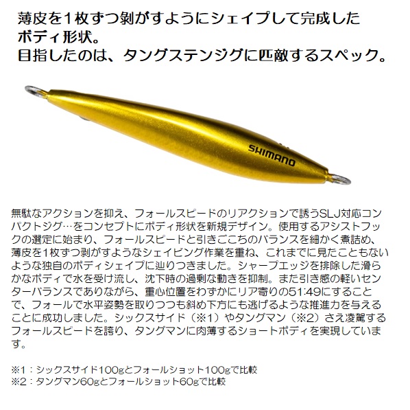 水を受け流す滑らかなボディでフォールが速い、センターバランスのコンパクトジグ。SLJや小型ベイトつきの青物など、小さなジグが効く時におすすめのセンターバランスのコンパクトジグ、フォールショット。水抵抗を生む凹凸やエッジをできるだけ排除し、水を受け流す滑らかなボディデザインを採用しました。過剰なフォールアクションを抑え、下に逃げるような速いフォールでリアクションバイトを誘います。