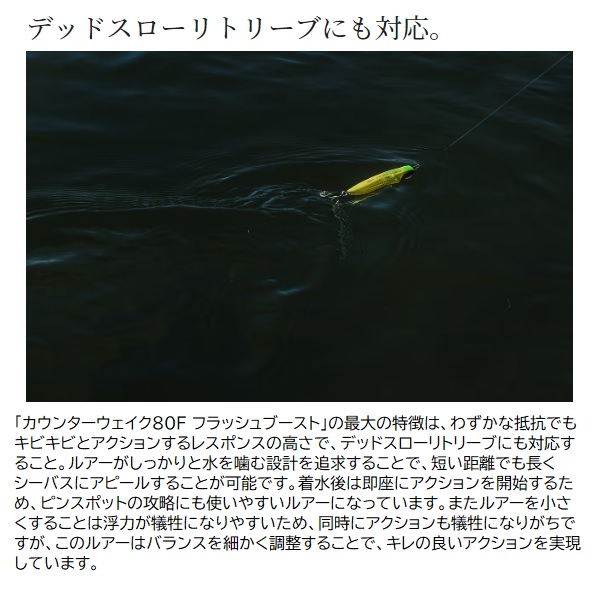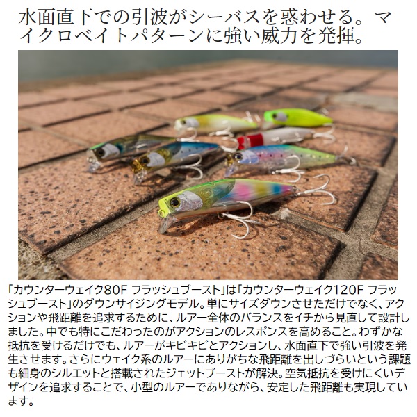 ハクからイナッコパターン攻略に。水面直下をキビキビ誘えるウェイク系ルアー。細身のウェイク系ルアーとして、水面直下でのアピールを得意とする「カウンターウェイク」に80mmの小型サイズが登場。喰わせやすい小型ボディで、ハクやイナッコがメインベイトとなっている、マイクロベイトパターンの時に活躍する設計です。オリジナルの120mmサイズをベースに、サイズダウンする際にこだわったのがアクションのレスポンス。ルアーが軽く引っ張られただけでも、リップがしっかりと水を噛んでルアーがキビキビとアクションします。また水面直下のレンジキープ性能に優れており、スローに誘いつつも、強い引波を発生させてシーバスにアピールするルアーです。