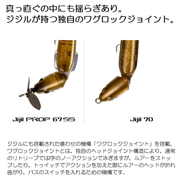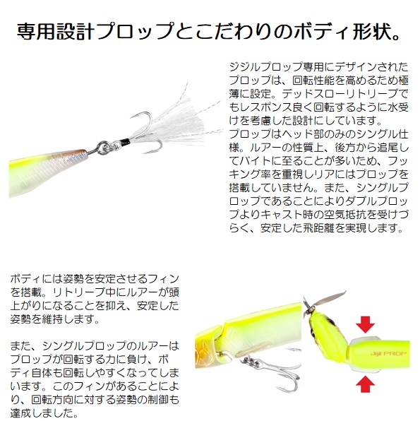 キモはシングルプロップ。スローに誘うプロップベイト。ジジルのプロップチューニングから生まれたジジルプロップ。とにかくスローにゆっくりと。デッドスローリトリーブで誘えるのが特徴です。使い方はシンプルで、プロップが回るスピードで限りなくゆっくり巻くこと。ここぞというスポットや見えた魚に対してデッドスローに誘えるシングルプロップベイトです。ダブルプロップではなく、シングルプロップにした理由はフッキング性能と飛距離の2つ。スローに誘う性能上、追わせて喰わせることがほとんどでリアフックにバイトすることも少なくありません。そういったときにプロップがフッキングの邪魔になることも。そんな不安要素を消すために、リアのプロップを無くしシングルプロップに。またプロップを一つ減らすことで空気抵抗が減少し、安定した飛距離を実現可能です。