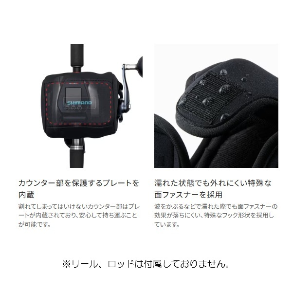 シマノ電動リールをしっかり保護する専用リールガード。シマノ電動リール専用リールガード。本体部には、耐衝撃性のある素材、カウンター部分にはハードボードを内蔵することで、リールへのキズや衝撃を軽減。リールにロッドをセットし、コードをつけたままでも装着可能です。