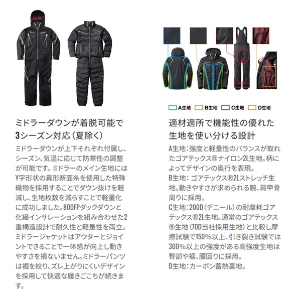ミドラーダウン上下着脱可能な3シーズン対応の磯用フラッグシップシステムスーツ。
