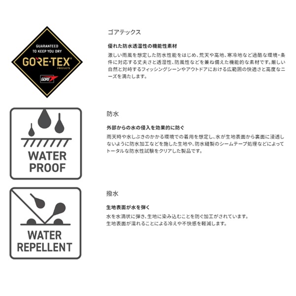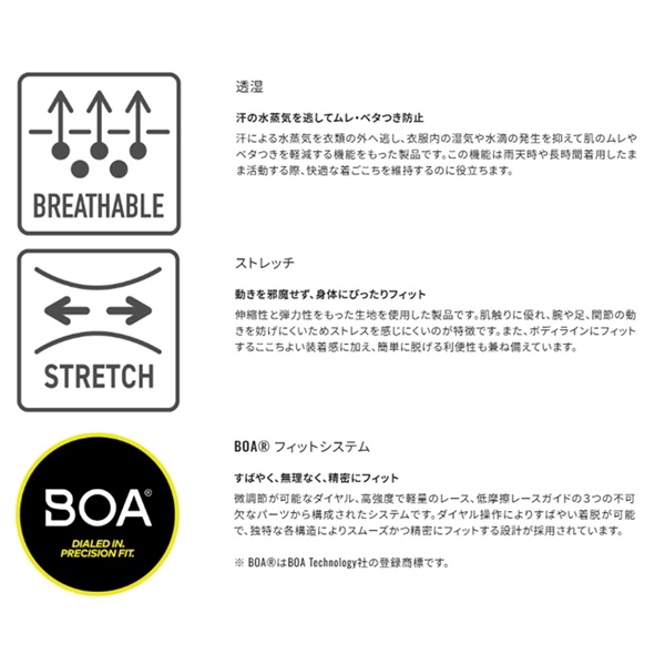 素材:表:ナイロン100%(ePE透湿防水加工) ストレッチ部分:ナイロン92%、ポリウレタン8%(ePE透湿防水加工) 中綿:ポリエステル100% 裏:ナイロン100% 部分:ナイロン100%/ポリエステル100%