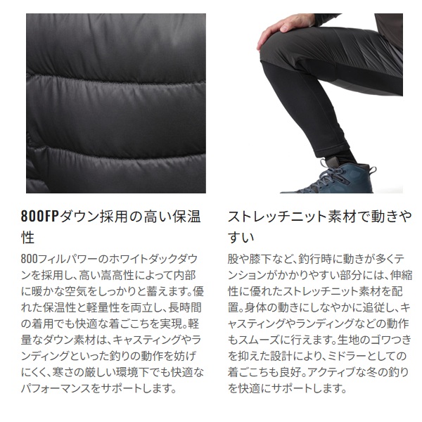 軽さ・暖かさ・動きやすさを兼ね備えた、ハイブリッド構造のフィッシング用ダウンミドラー。ミドルレイヤーに求められる「保温性」と「軽量性」を追求し、レインウェアの下に着用することを前提としたタイトフィット仕様を採用。寒さを感じやすいお尻や太もも部分には、800フィルパワーの高品質ダウンを封入し、しっかりと保温します。一方で、股下から膝下には動作性を重視したストレッチ素材を配置し、キャスティングやランディング時の動きやすさをサポート。さらに、膝をつく機会が多い釣りの動作に対応するため、膝部分には耐摩耗性の高い素材を採用しています。防寒性・機動力・耐久性のバランスに優れた、アングラーのための実用的なミドラーです。