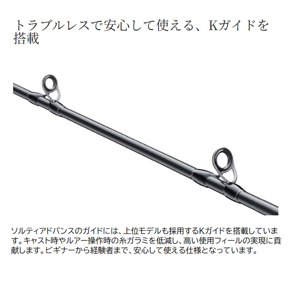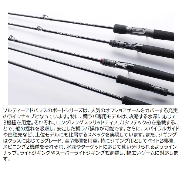 オフショアゲームをもっと身近に。充実のラインナップと魅力のハイコストパフォーマンスでサポートします。ターゲットやフィールド、そして釣り方に合わせて多様化するオフショアゲーム。ソルティーアドバンスシリーズは、オフショアゲームのトレンドに充実のラインナップで対応します。定番のタイラバゲームにはタフテックαやスパイラルガイドを採用した3モデルをラインナップ。等速巻きなどより高度な要求にもしっかりと応える仕様となっています。また、ジギングはSLJ(スーパーライトジギング)、LJ(ライトジギング)、ジギングと扱うジグに応じて3カテゴリー7モデルで対応。上位モデルの開発で培ったノウハウを投入することで、高いパフォーマンスを発揮しながら扱いやすい特性を実現。これからオフショアゲームを始めたいアングラーにもピッタリのシリーズとなっています。