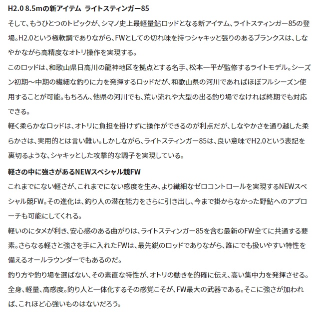 驚異的な軽量化。フェザーウェイト、新たな境地へ。羽のような軽さと優れた操作性を実現しながら、強い引きをもいなし受け止める安心感とタメ性能を両立。シマノ史上最軽量となるライトスティンガー85も新たにラインナップし、FW(フェザーウェイト)の新たな境地を切り拓く。