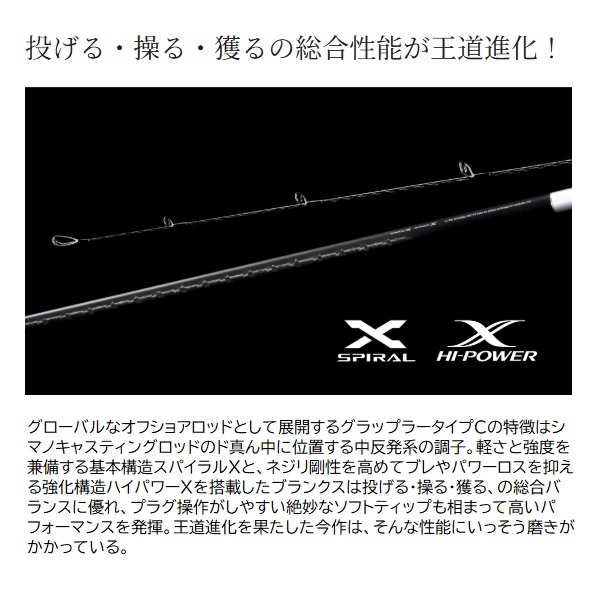 「キャスト・操作・ファイト」の総合性能が進化!キャスティングゲームの醍醐味を追求するType C。世界基準のオフショアスタンダードロッドとして、世界の大物を相手に鍛え上げたグラップラー。キャスティングゲームの醍醐味を追求したタイプ Cは、ブランクスにはスパイラル X とハイパワーX を採用し、シマノキャスティングロッドのド真ん中と言える中反発系のアクションに設計。キャスト・ルアー操作・ファイトの総合バランスに優れ、安定したキャスティングゲームをサポート。また最適化されたガイドシステムの効果も相まって、ライントラブルも抑制。リニューアルされた今作は、大物相手のパワーゲームを網羅するラインナップはそのままに、 L、ML パワーも充実。ブランクス やパーツ周りのデザインを徹底的に軽量化し、テクニカルかつエキサイティングなライトキャスティングゲームに活躍します。