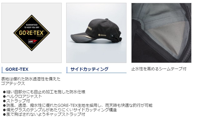 表地は優れた防水透湿性を備えたゴアテックス。●縫い目部分にも目止め加工を施した防水仕様●ベルクロアジャスト●ストラップ付●防風、透湿、撥水性に優れたGORE-TEX生地を採用し、雨天時も快適な釣行が可能●偏光グラスのテンプルがあたりにくいサイドカッティング構造●風で飛ばされないようキャップストラップ付※掲載している商品の画像は代表画像を表示しています。また実物と色が違って見える場合があります。あらかじめご了承下さい。