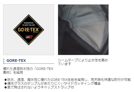 防水、透湿、撥水性に優れたGORE-TEX生地を採用し、雨天時も快適な釣行が可能。偏光グラスのテンプルがあたりにくいサイドカッティング構造。風で飛ばされないようキャップストラップ付。※掲載している商品の画像は代表画像を表示しています。また実物と色が違って見える場合があります。あらかじめご了承下さい。