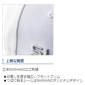 立体SHIMANOロゴ刺繍。●日差しを遮る幅広いフラットブリム●つばに貼るシールはSHIMANOオリジナルデザイン※掲載している商品の画像は代表画像を表示しています。また実物と色が違って見える場合があります。あらかじめご了承下さい。