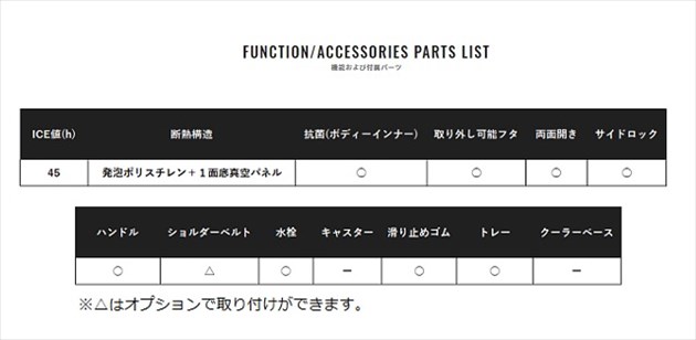 船、磯、防波堤と守備範囲の広いオールラウンダー。MADE IN JAPANの信頼性を凝縮したベーシックモデル。最大50cmの魚を曲げずにまっすぐ収納が可能。断熱材に軽量な発泡ポリスチレンと底面に真空パネルを採用することにより、I-CE値40hという十分な保冷力を確保しました。万が一の幼児閉じ込め等の事故防止のためにセーフティストッパー機能を新たに装備。ファミリーフィッシングでの安全性を高めました。