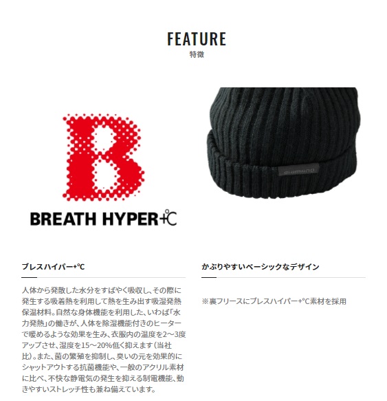 ベーシックなデザインに抜群の防寒性、裏起毛の暖かニットキャップ。タウンユースも可能なベーシックでウエアとの相性もよいニットキャップ。シンプルな見た目ながら、裏地フリースに汗を吸って熱に変える吸湿発熱素材のブレスハイパー+℃を使用しており、裏地がたっぷりと暖かい空気を含むことで保温性を発揮。この防寒性能は、晩秋や春先の夜釣りや、冬のオフショアなどでも強い味方となってくれるはずだ。