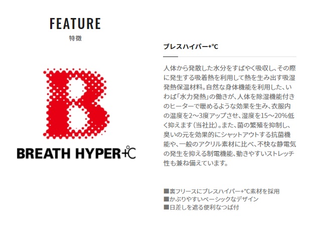 タフな環境に挑むアングラーの安全と快適さを確保。かぶりやすいベーシックなデザインとカラーラインアップで、ウェアとのコーディネートもしやすいつば付きのニットキャップ。裏地フリースに汗を吸って熱に変える吸湿発熱素材のブレスハイパー+℃を使用しており、裏地がたっぷりと暖かい空気を含むことで寒い冬の日でも高い保温性を発揮してくれる。また、針やルアー、紫外線などから顔を守るつば付なので、アクティブにポイントを回る際にもおすすめ。